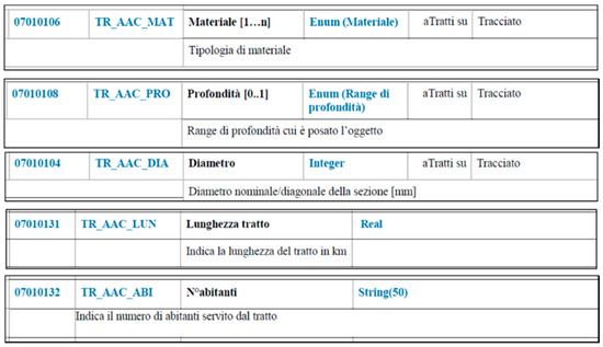 Then, the reference manuals of the water infrastructure engineering led to identifying the attributes able to characterize the IWS structure. Although it is not possible to examine details, Figure 6 is useful to show the complexity of the domain in terms of resources and properties. Along with geometric features, specific attributes were added according to both the performance indexes and the six technical quality macro indicators, as follows: