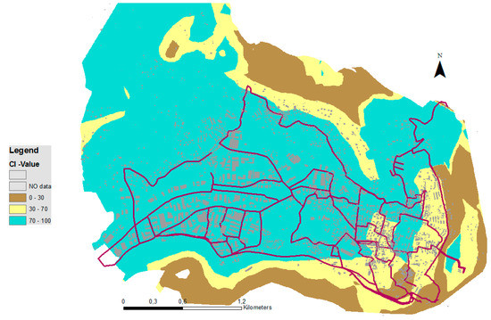 As for the aggregation method, TOPSIS represents a compensatory method. It uses linear functions, such as the arithmetic mean that is the most common scheme used in the development of composite indicators [58,59]. The main advantage is that it can be easily replicated, but at the same time, it neglects the imbalances between the sub-indicators and the composite index, which could lead to changes in the identified priority ranking [60]. To limit this problem, a Constant Elasticity of Substitution [61] can be introduced to generate the distances to ideal and anti-ideal solutions. In this way, different levels of compensation can be obtained between the individual indicators of the scoreboard, thus mitigating the effect of the spatial correlation. Moreover, by deriving the composite index also for evaluating the sewer and purification assets, the strengths and weaknesses of the performances of the entire IWS can be estimated.
