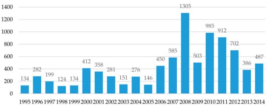The presented analyses of hazards, breakdowns, and construction disasters in Poland [44] show that over the last 50 years, the largest number of them concerned brick, mixed, and steel structures, followed by wooden and reinforced concrete (prefabricated or monolithic). The results are shown in Figure 1, and the number of construction disasters in Poland is shown in Figure 2.