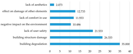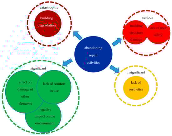 The effects of failure to repair individual building elements presented in Figure 3 are divided into catastrophic, serious, significant, and insignificant. The catastrophic effect was defined as degradation of the building, which may be caused by the lack of repair of damaged structural elements and gas pipes, tiled stoves, pipes, and electrical installation accessories. The consequences of serious omission of repairs included damage to the building’s structure and lack of safety of users. For example, a damaged roof covering may cause damage to the rafter framing and ceilings of the highest stores.