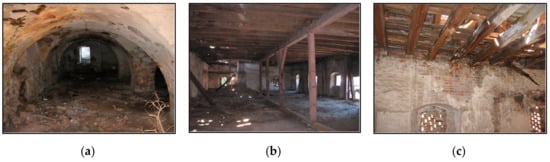 Figure 6. Granary building—cellar (a), first floor (b), second floor (c). (a) Moisture of vaults and basement pillars due to the lack of horizontal and vertical insulation. (b) First floor aboveground. (c) Damaged ends of floor beams in places where they rest on perimeter walls on the south side.