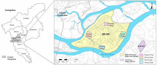 This case study sheds light on two different kinds of neighborhoods that are under different patterns of development-induced resettlement with the construction of a Higher Education Mega Center (HEMC), a well-known university town not only in Guangzhou but also in China. The major part of HEMC lies on the Xiaoguwei Island, Panyu District, connecting the central Guangzhou and its southern suburban. It covers an area of 17.9 km2 and a population of 0.23 million with 10 universities, abundant industrial zones and convenient public facilities, aiming to develop as ‘Guangzhou international innovation zone’ [75].