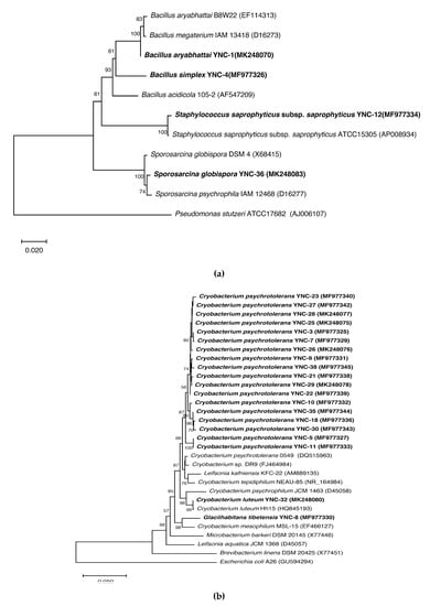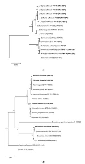 The three Gram-positive bacteria (Bacillus, Staphylococcus and Sporosarcina) belonging to the order Bacillales formed separate clades (Figure 2a). The four other Gram-positive bacteria (Cryobacterium, Glaciihabitans, Leifsonia, Dermacoccus) were affiliated to phylum Actinobacteria of order Micrococcales (Figure 2b,c and Figure 3). One other Gram-positive group Subtercola, belonging to the phylum Actinobacteria, formed a separate clade (Figure 4 and Figure 5). The three Gram-negative bacteria (Brevundimonas, Polaromonas, Variovorax) belonging to the phylum Proteobacteria formed separate clades (Figure 2d). One other Gram-negative group Enhydrobacter was affiliated to the phylum Proteobacteria of class Alphaproteobacteria (Figure 2a,b).