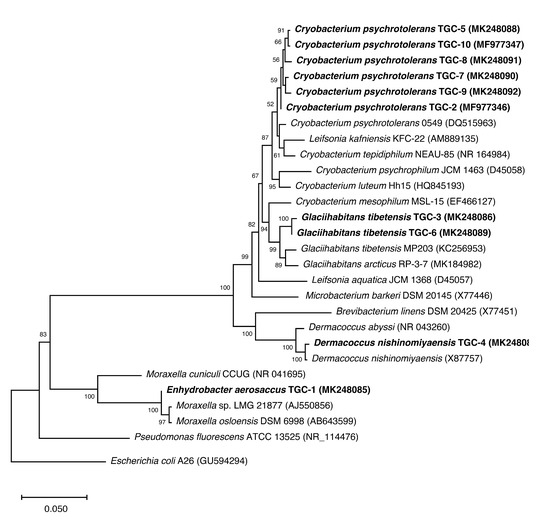 Phylogenetic tree of Bacterial strains of genera Cryobacterium, Dermacoccus, Enhydrobacter and Glaciihabitans analyzed from Thule glacier, Greenland, and reference species based on the 16S rRNA. The accession numbers are in parentheses. Tree was constructed using neighbor-joined method; each branch indicates a bootstrap value, and scale bar is estimated substitutions per nucleotide position.