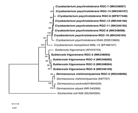 Phylogenetic tree of Bacterial strains of genera Cryobacterium, Dermacoccus, and Subtercola analyzed from Isunnguata Sermia glacier, Greenland, and reference species based on the 16S rRNA gene sequences. The accession numbers are shown in parentheses. Tree was constructed using neighbor-joined method; each branch indicates a bootstrap value, and scale bar is estimated substitutions per nucleotide position.