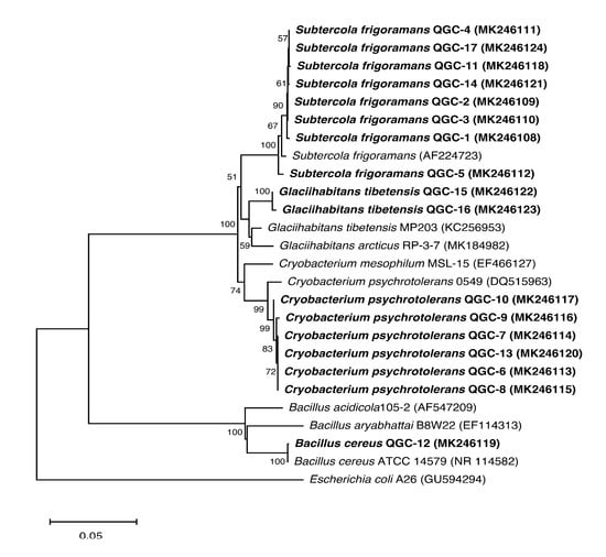 Phylogenetic tree of Bacterial strains of genera Bacillus, Cryobacterium, Glaciihabitans, and Subtercola analyzed from Qaanaaq glacier, Greenland, and reference species based on the 16S rRNA gene sequences. The accession numbers of strains are shown in parentheses. Tree was constructed using neighbor-joined method; each branch indicates a bootstrap value, and scale bar is estimated substitutions per nucleotide position.