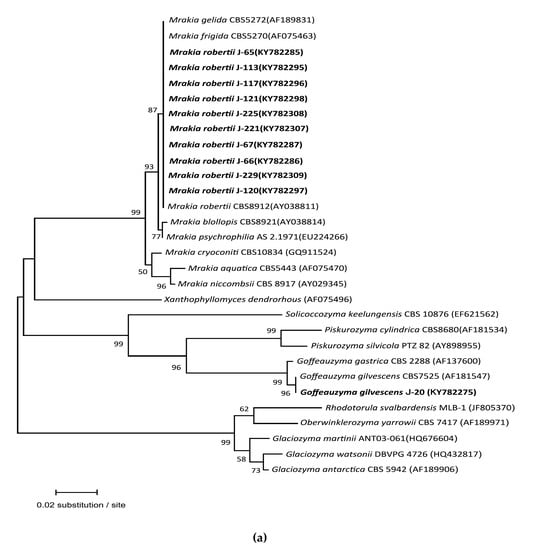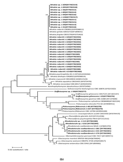 Phylogenetic tree of yeast species analyzed from: (a) Yala glacier, Himalaya, (b) Greenland glaciers (Qaanaaq, Thule and Isunnguata Sermia), The closely related species are based on ITS or D1/Dr2 domain of sequences. The accession numbers of strains are shown in parentheses. Tree was constructed using neighbor-joined method; each branch indicates a bootstrap value, and scale bar is estimated substitutions per nucleotide position.