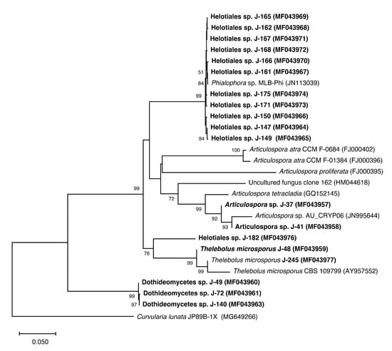 ITS and D1/D2 sequences of fungi were aligned using Clustal W and MEGA 7 [74]. The pairwise alignment was performed using EMBOSS Matcher-Pairwise Sequence Alignment tool [74,75,76,77,78,79,80,81,82]. Phylogenetic trees were constructed by Neighbor-joining method [71] with the Tamura-Nei model. Tree nodes were tested by bootstrap analysis with 1000 replicates, and a bootstrap percentage ≥50%.