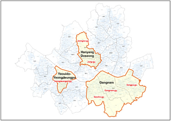 Seoul, the capital of Korea, serves as a national political, economic, and cultural center. It comprises 25 basic local governments called “gu,” which are similar to boroughs. The areas for this study are gus where the three main centers of Seoul are located. As Figure 1 illustrates, the Seoul Master Plan includes three main centers: Hanyang Doseong, Yeouido-Yeongdeungpo, and Gangnam [78]. Hanyang Doseong is a historic cultural center that is home to many historic buildings and government buildings, including Cheong Wa Dae (the Blue House) and Seoul City Hall, which spans Jongno-gu and Jung-gu. Yeouido-Yeongdeungpo is an international financial center where financial companies are concentrated, which is located at Yeongdeungpo-gu. Gangnam is an international business center with high-priced houses and commercial places popular with young people, which spans Gangnam-gu, Seocho-gu, and Songpa-gu. This study analyzed the use of space by gender for these six gus in Seoul using temporary population.