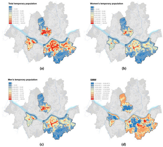Results of Kernel Density Estimation: (a) Total temporary population; (b) women’s temporary population; (c) men’s temporary population; and (d) subtraction of men’s temporary population from women’s temporary population (SMW).
