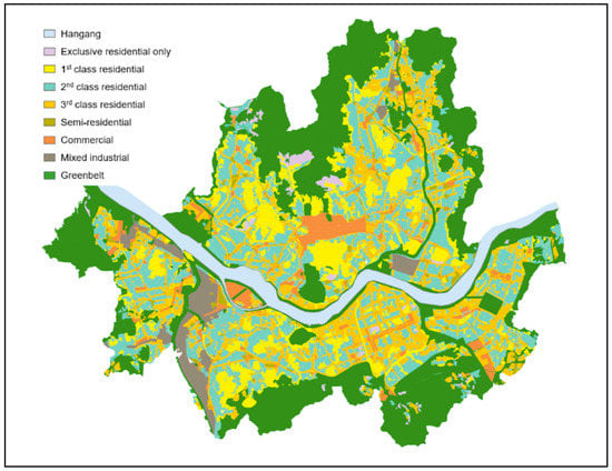 To analyze the patterns of temporary populations, kernel density mapping was performed using KDE of ArcGIS. As shown in Figure 2, the deeper the red color, the larger the temporary population was, and the deeper the blue color, the smaller the temporary population was. Regarding SMW, the deeper the red color, the more active women’s use of space was than men’s, and the deeper the blue color, the less active women’s use of space was. Figure 3 is a zoning map that shows land use patterns of Seoul. By comparing Figure 2 and Figure 3, we found the relationship between temporary population and land use.