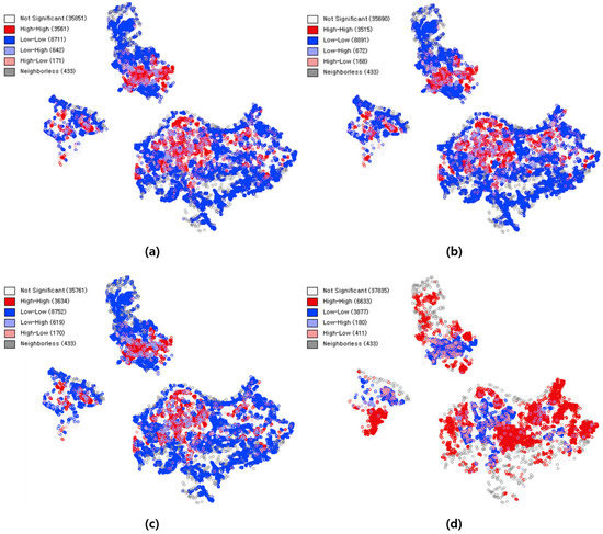 Local indicators of spatial association (LISA) cluster maps: (a) Total temporary population; (b) women’s temporary population (c) men’s temporary population; and (d) SMW.