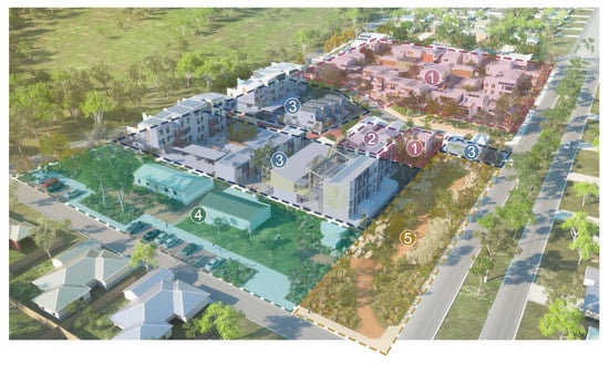WGV precinct: (1) detached dwellings; (2) attached dwellings; (3) apartment sites; (4) public open space and community buildings; and (5) historical stormwater drainage reserve retrofitted into public green space. Source: authors, adapted from Last Pixel.