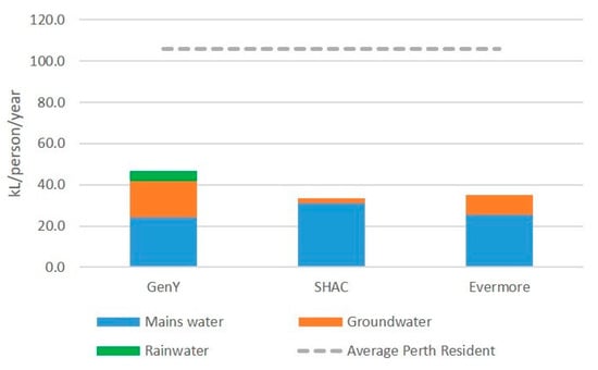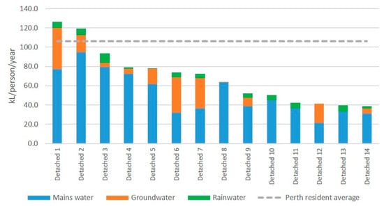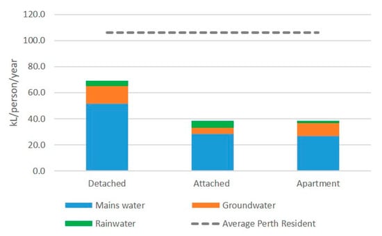 Figure 2 shows a profile of annual per-person water consumption by source for each of the three main typologies. It also shows the Perth average per-person annual consumption for comparison [].