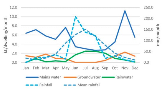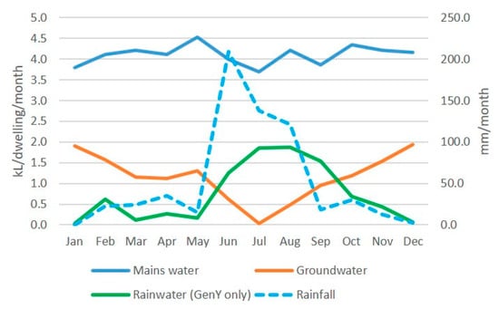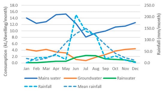 Figure 8 illustrates the interaction of the three water sources over time and rainfall records from the same period in WGV apartments. Note that only the three apartments at the GenY House have rainwater connected; hence, it is plotted per these dwellings rather than averaged across all apartments. Mains water consumption is slightly variable but does not noticeably reduce as cool weather and rainfall arrives in late autumn. There is a to-be-expected increase in rainwater consumption with rainfall. The variability from month to month is less with this typology, reflecting the larger number of residents, with a diversity of individual water consumption patterns, that have been combined here.