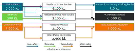 - Aurora Estate: a 700 ha development that accommodates over 25,000 people in Victoria [,]. The development aimed to reduce mains water consumption by 72% in comparison to the state typical residents. Mains water reduction strategies included the implementation of rainwater harvesting and a community-scale recycled water scheme.