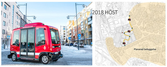 Since October 2018, automated buses have been operating in Barkabystaden as public transport line 549. Line 549 is the first public transport line in the world with automated electric buses on a regular, scheduled service. The buses have space for twelve passengers (six seated and six standing) (See Figure 1 Left, for an image of an automated bus). The automated buses operate between newly built residential blocks, Herrestaskolan and Stora Torget, where a switch to regular bus lines could take place (See Figure 1 Right, for the automated bus route). Currently, the length of the line is 2.5 km, and it is planned that the service route would be doubled in 2020. The current maximum speed is 12 km/h; later, the speed would reach 18 km/h. The automated buses are combined with high-speed buses between Barkarby station, Barkarby city, and Akalla. By integrating a first/last mile feeder service with a public transport service, the aim is to provide a better door-to-door travel experience.