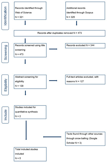 A total of 647 articles were exported to the DistillerSR web-based application for screening. A total of 174 duplicate articles were quarantined using the duplicate detection function leaving 473 unique articles. A total of 344 articles were excluded using title screening. The remaining 129 articles were excluded following abstract and full-text screening. Only two articles were considered for data extraction. Three additional references were identified through handpicking and snowballing for data extraction (Figure 1).