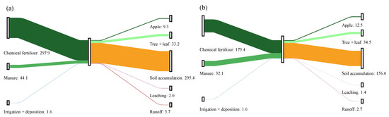 where, Papple was calculated as apple yield multiplied by P concentration in apples. Pleaf and Ptree were calculated with leaf and tree growth multiplied by their P concentration. The apple yield, and biomass of leaf and tree were obtained from the survey data. The typical P concentration in apples, tree, and leaf was obtained from previous studies [26].