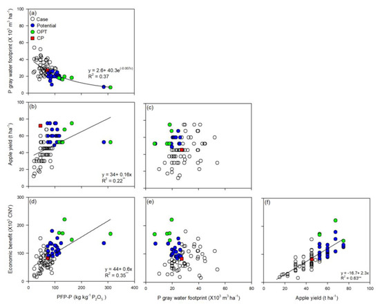One distinctive feature of the results is synergies between PFP-P and apple yield, as well as economic benefit (Figure 3b,d). Concurrently, a trade-off between PFP-P and P gray water footprint was observed (Figure 3a). This suggests that PFP-P is the key factor for sustainable apple production and underpins a potential strategy to produce high economic benefit and yield with limited negative environmental impacts by improving P-use efficiency. PFP-P is complex with many components. Here it is defined as yield produced per unit of P2O5 applied. In practice, PFP-P has always been part of overall integrated crop management and site-specific nutrient management due to the relationship between yield and P input [27].