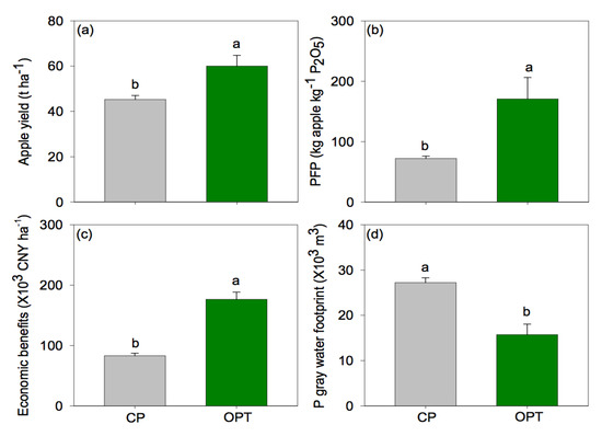 Apple yield (a), partial factor of productivity (PFP), defined here as kilograms of apples produced per kilogram of P2O5 applied (b), economic benefit (c), and P gray water footprint (d) under current practice and OPT growers in Quzhou County in 2017. Each value is the mean of cases (+SE). Different lower case letters denote significant difference (p ≤ 0.05) between categories.