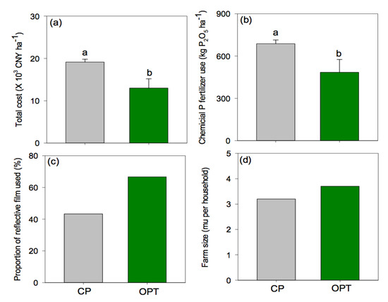 Total cost (a), P application rate (b), proportion of reflective film used by growers (c), and farm size (d) under current farmer practice (CP) and Pareto rank 1 growers (OPT) in Quzhou County in 2017. In (a) and (b), each value is the mean of cases (+SE). Different lower case letters denote significant difference (p ≤ 0.05) between categories.