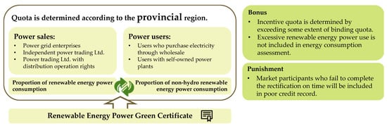 In addition to the carbon trading system, other regulations are also introduced by the government in China to promote the use of renewable energy and restrict the carbon emissions. After three draft versions, the official document of Guarantee Mechanism of Renewable Energy Power Consumption was issued in 2019 by NRDC and National Energy Administration (NEA) []. According to the regulation, the test assessment will be carried out on the relevant market participants in 2019. Comprehensive monitoring and formal assessment will begin in 2020. Renewable energy utilization will become a mandatory indicator at the provincial level in China. Details are shown in Figure 1. The proportions of renewable energy and non-hydropower renewable energy consumption in total will be supervised separately. Power sales and power users are asked to achieve the requirement. If the company or province overfulfil the task to the incentive standards, the surplus energy consumption will not be included in energy consumption assessments for the company or province. If they are unable to meet the standards, two possible solutions are provided. The first one is purchasing from other market participants who have extra the annual quota. The other is purchasing equal amount of Renewable Energy Power Green Certificate to compensate the deficiency. If the subjects still cannot achieve the target, they will be punished by the government and listed in the poor credit record.