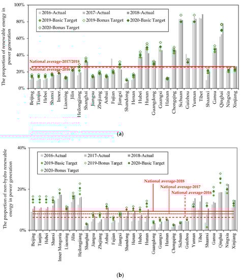 The development of renewable energy power generation. (a). Proportion of renewable energy power consumption: actual situation in 2016/2017/2018 and target for 2019/2020. (b). Proportion of renewable energy power consumption: actual situation in 2016/2017/2018 and target for 2019/2020.