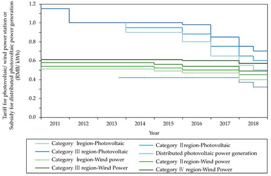 Except for the check-up system, incentive policies are also applied in China to support the relevant industries and technology applications. The first renewable energy subsidy policy was released in 2011. Photovoltaic and wind power are the two most popular objects, and the subsidy amounts are shown in Figure 3 [,,,]. Because of different natural conditions, different regions enjoy different subsidy policies. Places with worse natural conditions will enjoy higher subsidy amounts. Two pathways are applied to allocate the incentives. The first one is feed-in tariff. The power grid company has to purchase renewable generation at a certain price. The gap between renewable power price and coal-fired power price will be balanced by the government. The other way is by directly providing financial support for power generation. Power plants can receive a certain number of subsidies for every kilowatt-hour of renewable energy produced. The differences in subsidy schemes are mainly due to the fact that part of distributed renewable energy generation is used for self-sufficiency and is not connected to the grid. If the power generation owners are qualified for subsidy, the subsidy will last for 20 years for the program. With the technical progress and financial pressure on the government, subsidies per unit of power generation are falling. Renewable power generation projects with equal price to coal-fired power generation are encouraged. On the promise of ensuring electricity consumption, priority is given to the construction of these projects. As a whole, financial support for renewable generation will disappear soon.