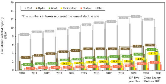 Carbon intensity of the power grid also plays an important role in enterprise-level energy saving and emission reduction. If the electricity from power grid can have lower carbon emission intensity, under the constant power consumption scenario, the pressure from the user side will be reduced. During the past two decades, the cumulative installed capacity of coal-fired power grew at a snail’s pace, and that of renewable energy increased dramatically as shown in Figure 4 [,,,]. According to the prediction from China Energy Outlook 2030, the installed capacity of coal-fired will even decrease in 2030. In 2030, the power installed capacity of different energy sources will be significantly changed compared with 2010. The carbon intensities of different energy sources of electricity generation in this study are based on a literature review [,,,,,,,]. We assume there will be a small drop in carbon emissions produced per unit of coal-fired power generation, from 1230.0 g-CO2/kWh in 2010, to 1136.7 g-CO2/kWh in 2030, and carbon intensities of other electricity generation pathways will remain constant. Based on the 13th Five-Year Plan for Electric Power Development in China, the line loss rate dropped from 6.53% in 2010 to 6.64% in 2015 and will decline to 6.50% in 2020. We assume that it will drop to 6.40% in 2030.