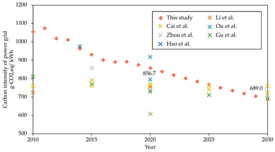 Based on status quo, government planning and a literature review, the final results of carbon intensity of the power grid in China are shown in Figure 5. The reduction in carbon intensity is mainly attributed to the improvement of energy structure brought about by the introduction of more renewable energy sources. Considering the cost of investment, it is impossible for coal-fired power plants to shut down very quickly and on a very large scale. Therefore, the carbon intensity of electric power will not decrease sharply in a short time. Power users still need to take some measures in their own ways if they are asked to realize a higher carbon emissions reduction target. Based on our study, carbon intensity of electricity consumption from power grid will fall to 856.7 g-CO2 in 2020 and 689.0 g-CO2 in 2030, which is only 65% of that in 2010. Compared with previous research, the carbon intensity in this study is a little bit higher [,,,,,]. This is because we consider the carbon intensity of the electricity at the user end which includes the line losses, rather than the power generation end.