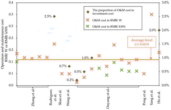 The investment cost of photovoltaic has experienced a significant drop during the past decade, as shown in Figure 8, with the increase in cumulative capacity and research investment []. However, various studies show different results. As for 2010, the data changes from 12.0 to 35.7 RMB/W in China. Reviewing different results, the red rhombuses show the forecast in this study from 2016 to 2020. The O&M cost was mainly calculated by three methods: certain cost per capacity, certain cost per power generation, or certain proportion of investment cost. Compared to the investment cost, the O&M costs are relatively stable. Due to the accessibility of data in China, 0.11 RMB/W is used in this study, as shown in Figure 9 [,,,,,,,]. The insurance fee is not a common cost mentioned in previous studies; thus, it is not included in this study. As mentioned before, the lifetime of an inverter is 10 years, so updates should be made twice during its life. The prices of inverters vary from 0.5 to 2.8 RMB/W in different research. Considering the cost reduction caused by technological advances, 0.75 RMB/W is used in this study. Loan proportion in initial investment and the interest of loan are other important parts in photovoltaic construction. Based on the research of Yuan et al., 20% is a reasonable proportion. Other basic assumptions used in this article are listed in Table 2. Cost of roof rent is not included in this study. We assume that the property right of the roof and the power user are unified. The price of electricity for industrial use in China is relatively stable, so we assume it keeps constant. The average of peak- and low-hour electricity price is used in this study.