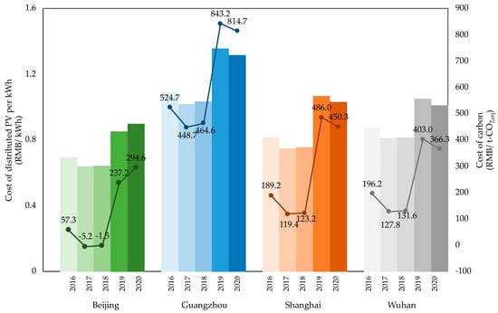 The economic analysis of renewable energy is a hot topic to evaluate the effectiveness of national targets and supporting policies. It is also an essential part for enterprises to decide which solution should be used to reduce carbon emissions. Many previous studies mentioned that the high cost was the key restriction for renewable energy development [,,]. Currently, only distributed photovoltaic systems can be extensively applied to industry buildings to support self-use. Though dispersed wind power has become an engaging topic, it still will take some time for large-scale promotions to occur. Wind power plant construction has higher site and technical requirements than photovoltaic power generation. Besides, the business mode for dispersed wind power is uncertain. The purchased price of renewable energy from platforms and the contract price with power dealers are difficult to obtain. Therefore, in this study, only the cost estimation of self-used distributed photovoltaic power is determined to evaluate the cost of carbon emissions for enterprises and we compare it to carbon price.