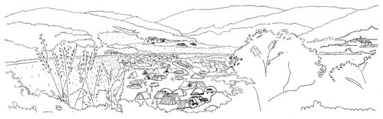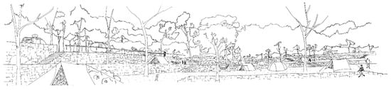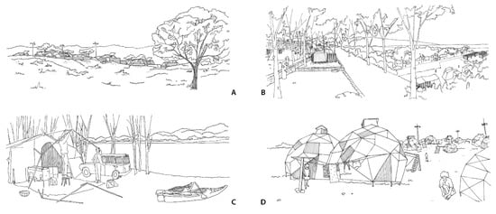 - Limits: natural elements, artificial elements, edges. The campsite must be a permeable enclosure, which is directly related to the elements of the site. The boundaries must be transformed into edges, as areas with thickness that meet all the requirements and incorporate multiple superimposed filters, both natural and artificial [78]. For instance, in rural contexts, a sequence of low embankment, vegetation, water and a transparent fence provide a slight but secure separation which improves the quality of the views (Figure 9C).