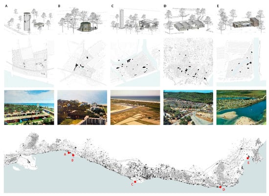 - LAGUNA campsite (Castelló d’Empúries, Girona, 1968–present): it was designed by the architect Josep Maria Pla Torras in an isolated estate between marshes and located at the end of a 5 km road, which runs between agricultural fields towards the beach. This natural context contrasts with the upcoming tourist development of Empuriabrava, right on the opposite bank of La Muga river. The public buildings follow a common system formed by vaults. The plots are located around a lagoon that structures the settlement. Nowadays, it is still active within the Integral Protection Zone of the Aiguamolls de l’Empordà Natural Park and it maintains its natural character in relation to the landscape (Figure 6E).