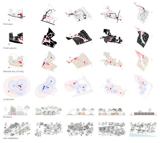 - Individual and Community: the campsite encourages the use of the natural environment as a shared public space. Pathways, outdoor activities or common pavilions are aspects that reinforce the identity and sense of belonging to a group. But the individual, as an inhabitant, must also be able to solve his or her most basic needs and have a refuge from maintain daily rites (Figure 4D).