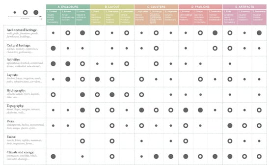 | Activities | Existing or previous uses of the site relate the settlement to its context and encourage the rooting. | Agricultural, livestock, leisure, commercial, residential, educational, etc. |