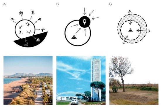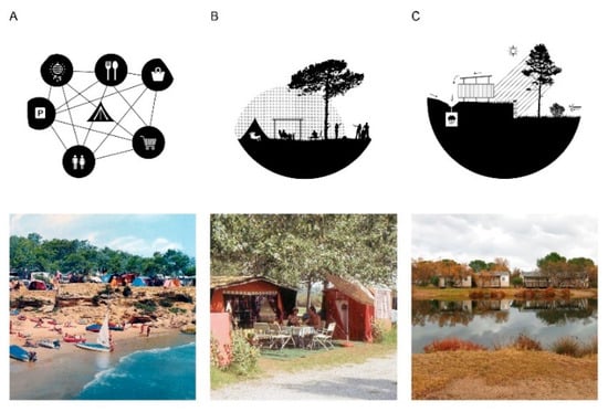 - Context: visuals, mobility, climate, permeability. The campsite must recognize the qualities of the place, be part of it and assimilate its own dynamics. Integration in the landscape involves giving value to its characteristics—geographical, visual, historical, functional, etc., introducing and enhancing them in the design. For instance, in littoral campsites, beach dunes free from users’ occupation enhance autochthonous flora preservation and flood prevention (Figure 9A).