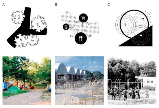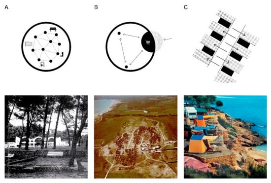 - SALOU campsite (Salou, Tarragona, 1956–1987): it was initially designed by the architect José Maria Monravà, but over time other architects also took part in its development, such as Antoni Bonet Castellana, Josep Puig Torné and Jaume Argilaga. It was located below a pine forest, halfway between Salou and Cap Salou, so it had some sectors with sloped topography and sea views, protected by the pines’ shade. The urban growth of Salou exerted great pressure on the settlement, which was finally converted into the Municipal Park of Salou (Figure 6B).