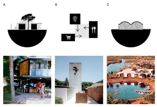 - CALA GOGÓ campsite (Calonge, Girona, 1961–present): it was designed by the architects Antoni Bonet Castellana and Josep Puig Torné on a land with a topographic difference of about 90 m from sea towards inland. The coastal road crossed the settlement at the bottom, where the main entrance and one of the first nightclubs in the area were located. For its implementation they used the development of existing agricultural terraces. The buildings were built on stone platforms and with a common system based on the traditional Catalan vault. It is still active today with some adaptations motivated by new trends in the sector (Figure 6D).
