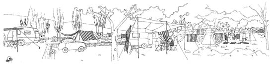 - Itinerant: situation, rotation, adaptation. Occupations with transportable lodgings should be facilitated and enhanced due to their temporary and environmentally nature friendly character. Itinerant accommodation belongs to the users, who install it, adapt it and move with it. Thus, at the end of the stay it disappears and frees up areas of the settlement that can be easily renewed. For instance, users’ adaptation by means of tents, caravans or fabrics in relation to the natural elements on-site—trees, bushes—provides different levels of intimacy and social interaction, from public space to private beds (Figure 13B).