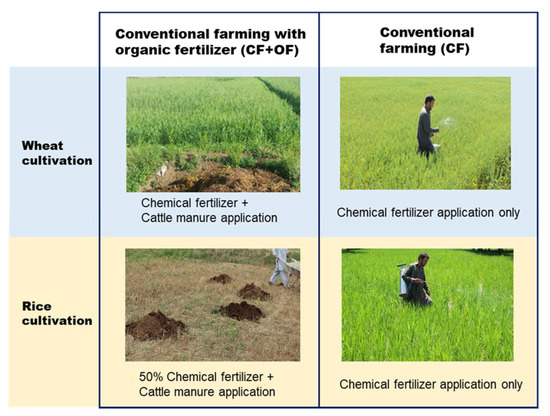 The farmers in this region apply 150 kg ha−1 di-ammonium-phosphate (DAP) and 200 kg ha−1 urea for wheat and rice production under the conventional farming (CF) practice. The other farmers use cattle manure (7.5 t ha−1) along with a half dose of the chemical fertilizers under the conventional farming with organic fertilizer application (CF+OF) practice (Figure 3). The CF+OF farmers have been using cattle manure for four years. The nutrients of this farm-made cattle manure were 31.8% total C, 1.2% total N, 0.75% K2O, 0.18% P2O5, 0.11% MgO, and 0.13% CaO, with a C:N ratio of 25.9.