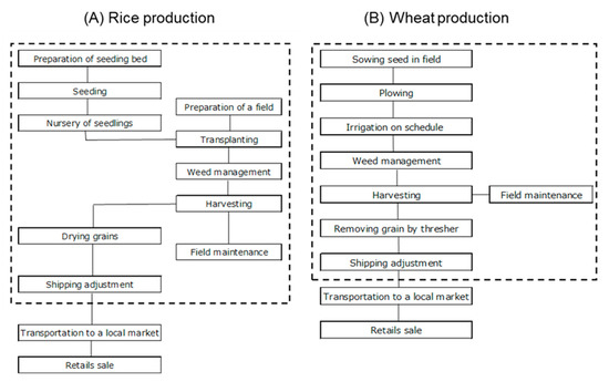 As the main function of the system under this study is to produce rice and wheat as the main staples, the functional unit selected is 1 kg of each grain. The scope of assessment is limited to the arable land (cradle-to-farm gate), excluding the manufacturing, packing, and transportation of raw materials (agrochemicals and farming tools such as nursery boxes and grain bags). The system boundaries of each cropping system are shown in Figure 4. This study covers the entire life cycle of farm activities including the field preparation, seeding, field management, harvesting, and grain adjustment before shipping to the market. For the LCA analysis, the environmental impacts considered include abiotic resource depletion (the fuel consumption), global warming (nitrogen input and agrochemical use), and land use (crop yields). These data were obtained from the interviews described in Section 2.2. The costs of each crop production were also calculated to optimize eco-efficiency as a financial function. The details of GHG emission basic units used for LCA calculation is described in Supplementary Materials. Table 2 shows the main process of the life cycle of rice and wheat production and their sources of data. Due to the limitations of data collection, agricultural materials such as nursery boxes and manual tools that could be used for more than one year were excluded from the LCA calculation. Plastic materials disposed of within one year were counted as plastic waste.