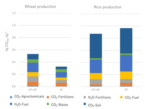 The GHG emissions per kg of grain in the CF+OF system were 0.53 kg–CO2 for wheat and 0.87 kg–CO2 for the rice production. In the CF system, the GHG emissions were 0.32 kg–CO2 for wheat and 0.96 kg–CO2 for rice. The total CO2 emissions were higher in the rice cultivation than those in the wheat production. The fuel consumption was the major contributor of GHG emission in wheat production. On the other hand, in the rice production systems, CO2 emissions from the soil accounted for almost half of the total CO2 emissions because of CH4 emission from paddy fields (Figure 5).