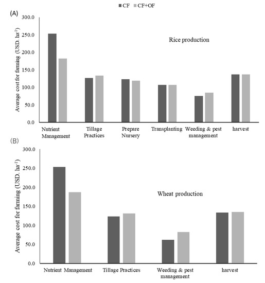 Average farming costs (USD ha−1) for rice production (A) and wheat production (B) in conventional farming (CF) and conventional farming with organic fertilizer (CF+OF) systems in Khost Province, Afghanistan.