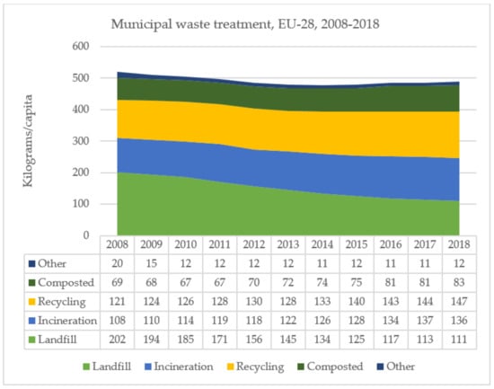 - Eurostat Municipal Waste by Waste Management Operations. Available online: https://appsso.eurostat.ec.europa.eu/nui/submitViewTableAction.do (accessed on 16 July 2020).