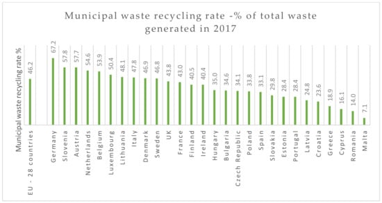 Figure 4 presents the municipal waste recycling rates in 2017 for the 28 EU countries. This indicator measures the percentage of recycled waste in the total amount generated in each country and includes material recycling, composting and anaerobic digestion. As can be observed in Figure 4, Germany is the country with the highest recycling rate (67.2%) in the EU. Based on this result, it can be stated that even if it is the country that generates the largest amount of waste, the country also manages properly a large amount of the generated waste. On the other hand, Romania is among the last two countries with respect to this indicator, scoring only 14% for the municipal waste recycling rate, while the EU average for municipal waste recycling is 46.2%.