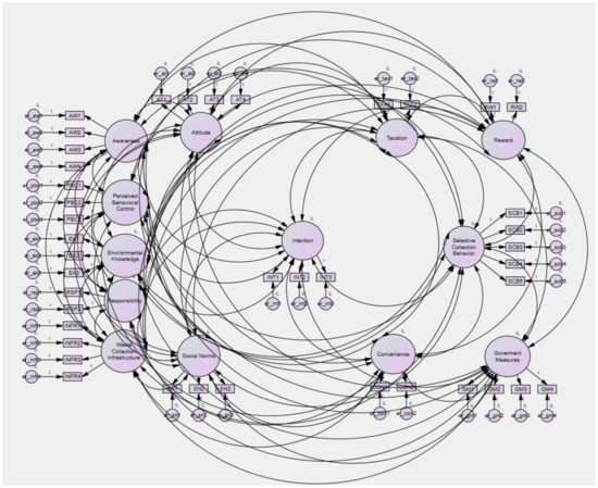 As a result, the following elements were considered: Attitude (AT), Awareness (AW), Perceived Behavioral Control (PBC), Convenience (CON), Environmental Knowledge (EK), Selective Collection Behavior (SCB), Government Measures (GM), Intention (INT), Waste Collection Infrastructure (INFR), Social Norms (SN), Responsibility (RSP), Reward (RW) and Taxation (TAX).