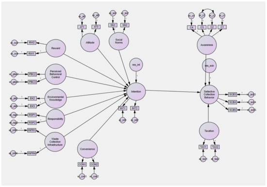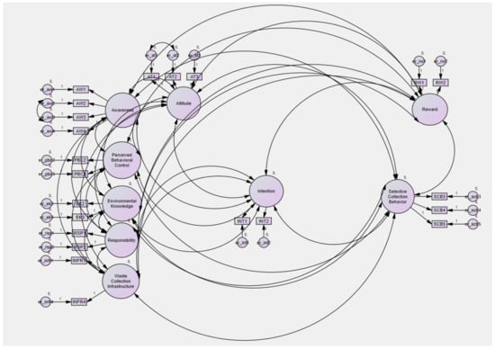 Data gathered through the questionnaire were analyzed and validated using IBM SPSS Amos 26.0.0 [56], by following the steps recommended in Byrne [57]. The structure of the components is presented in Figure 6.