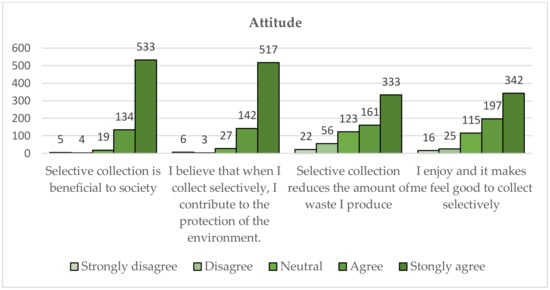 The study conducted by Tonglet et al. [15] presents a model in which attitude, social norms and control of perceived behavior influence the intention of selective collection, and intention influences behavior. The results of the study showed that a positive attitude towards selective collection was the best predictor of behavior, and it was also the strongest factor correlated with the intention of selective collection [15].